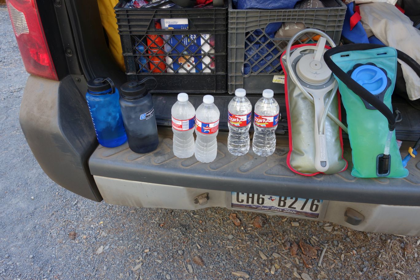 Anyway, here’s our loadout for the hike! Lots of climbing and it’s already getting warm. So we need lots of water and electrolytes. We parked the car, got our gear together, and set off.